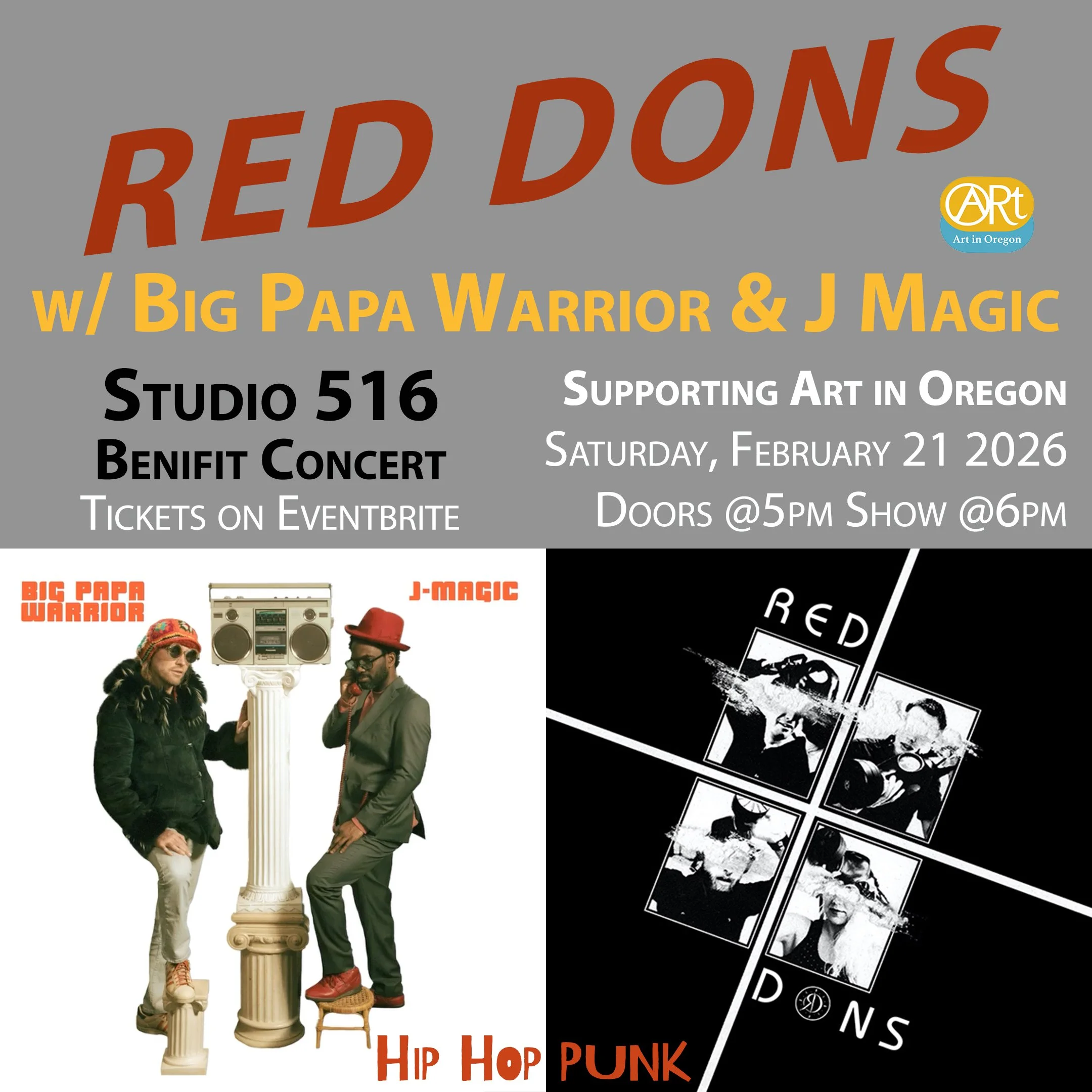 This special benefit concert brings together two powerful forces in Portland's music and visual art communities for one unforgettable evening at Studio 516. Hip hop duo Big Papa Warrior & J Magic and legendary Portland punk band Red Dons will perform back-to-back inside the working art studio shared by artists and collaborators Jeremy Okai Davis and Tammy Jo Wilson —a space known for hosting vibrant exhibitions, gatherings, and cultural exchange.